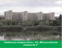 КЗ «Міська клінічна лікарня № 2» заснована у 1932 році, як заклад для обслуговування металургів та будівників міста. В 1978 році почалося будівництво будівлі лікарні на території Саксаганського району, а в 1989 році в закладі, відкритому на мікрорайоні Сонячному, прийнято перших пацієнтів. У 2002 році відкривається поліклінічне відділення. На теперішній час КЗ «Міська клінічна лікарня № 2» є найбільшим у місті лікувальним закладом, який має п’ятнадцять відділень, стаціонар на 810 ліжок та обслуговує 39 тисяч дорослого населення.