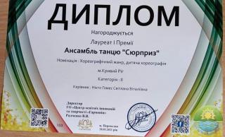 Відділ культури виконкому районної у місті ради вітає з перемогою ансамбль танцю «Сюрприз» (керівник Світлана Нієто Гомес) КЗСМО «Музична школа №5» КМР з перемогою у XI Міжнародному багатожанровому фестивалі-конкурсі мистецтв «Зіркова Весна» (м. Переяслав), де вони посіли І місце.