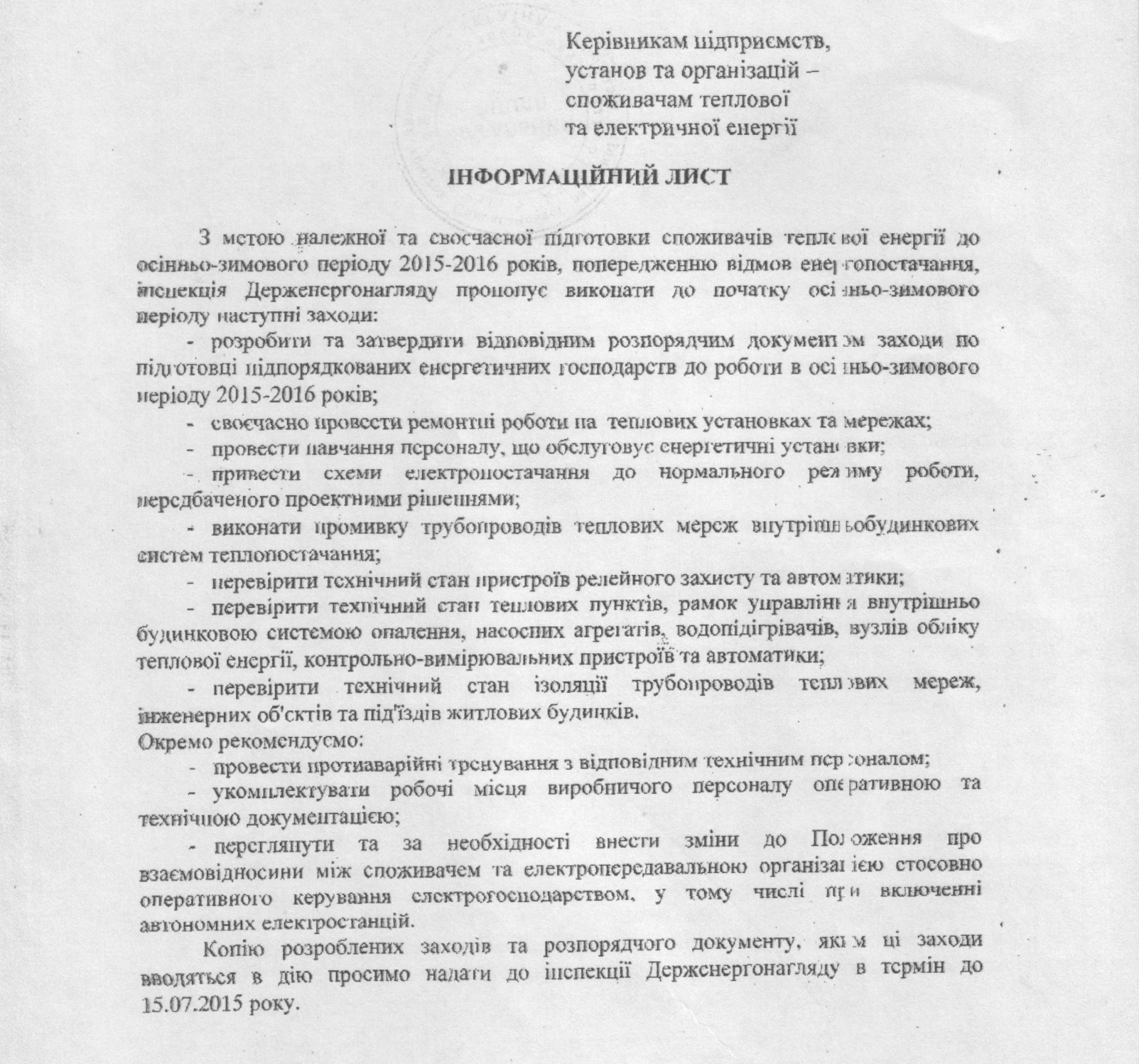 Інформаційні листи Державної інспекції з енергетичного нагляду за режимами споживання електричної і теплової енергії
