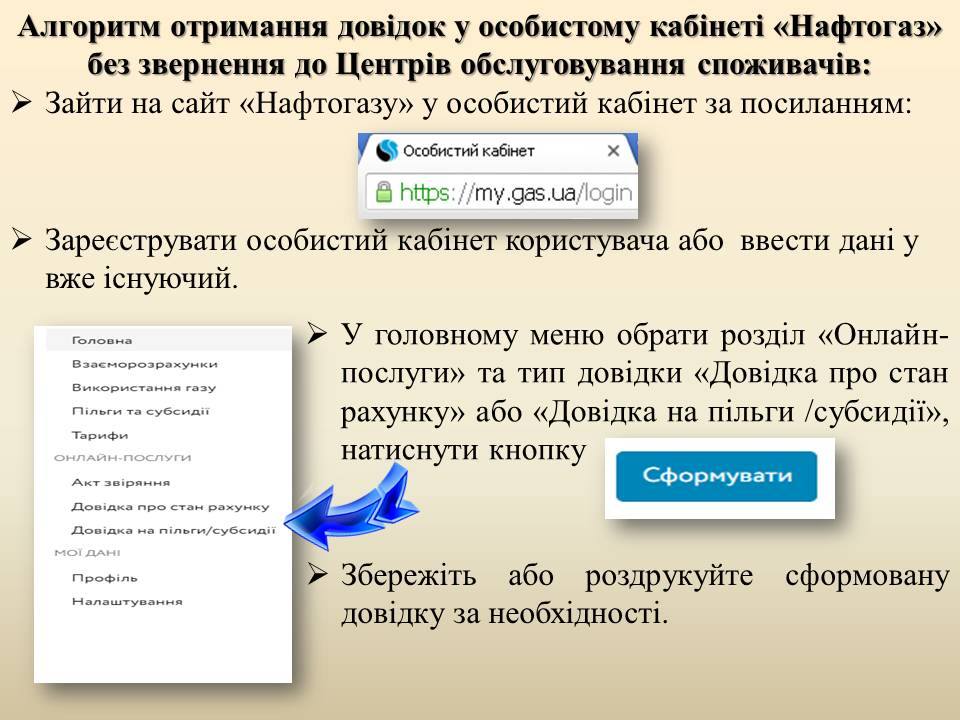 Споживачам «Нафтогазу» для отримання довідки у особистому кабінеті без звернення до Центрів обслуговування необхідно зайти на сайт за посиланням https://my.gas.ua, зареєструвати особистий кабінет користувача або ввести дані у вже існуючий. У головному меню обрати розділ «Онлайн-послуги» та тип довідки «Довідка про стан рахунку» або «Довідка на пільги/субсидії», натиснути кнопку «Сформувати», зберегти та роздрукувати сформовану довідку за необхідності.