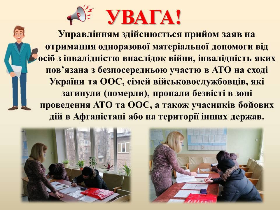 Управлінням праці та соціального захисту населення здійснюється прийом заяв на отримання одноразової матеріальної допомоги від осіб з інвалідністю внаслідок війни, інвалідність яких пов’язана з безпосередньою участю в АТО на сході України та ООС, сімей військовослужбовців, які загинули (померли), пропали безвісті в зоні проведення АТО та ООС, а також учасників бойових дій в Афганістані або на території інших держав.