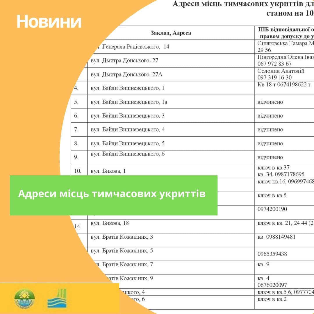 Контакти відповідальних за стан укриттів по Саксаганському районі:+38 068 870 58 44 +38 096 623 43 63 +38 068 654 39 70+38 093 469 86 80