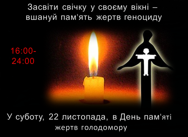 Із настанням темряви засвітіть свічку у своєму вікні. Цей вогник символізуватиме нашу скорботу про мільйони загублених життів співвітчизників, адже це є святим обов’язком усіх українців і свідченням того, що ми пам’ятаємо. Україна пам’ятає. Світ визнає.