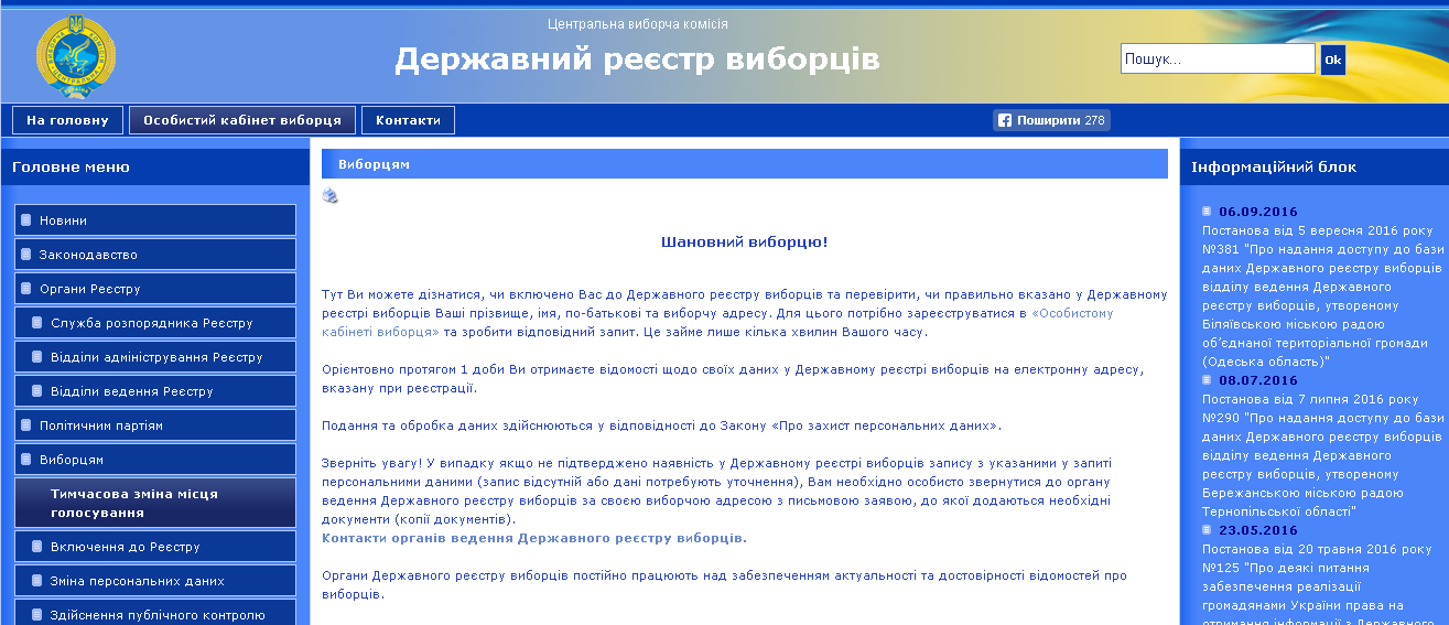 На офіційному веб-сайті «Державний реєстр виборців» функціонує програмний ресурс «Особистий кабінет виборця», в якому громадяни мають змогу перевірити інформацію про своє включення (невключення) до Державного реєстру виборців. У 2018 році надійшло 5 звернень від виборців щодо змісту своїх персональних даних, які містяться у Реєстрі. Протягом доби на вказану виборцем електрону адресу надійшли відповіді щодо змісту персональних даних у Державному реєстрі виборців.