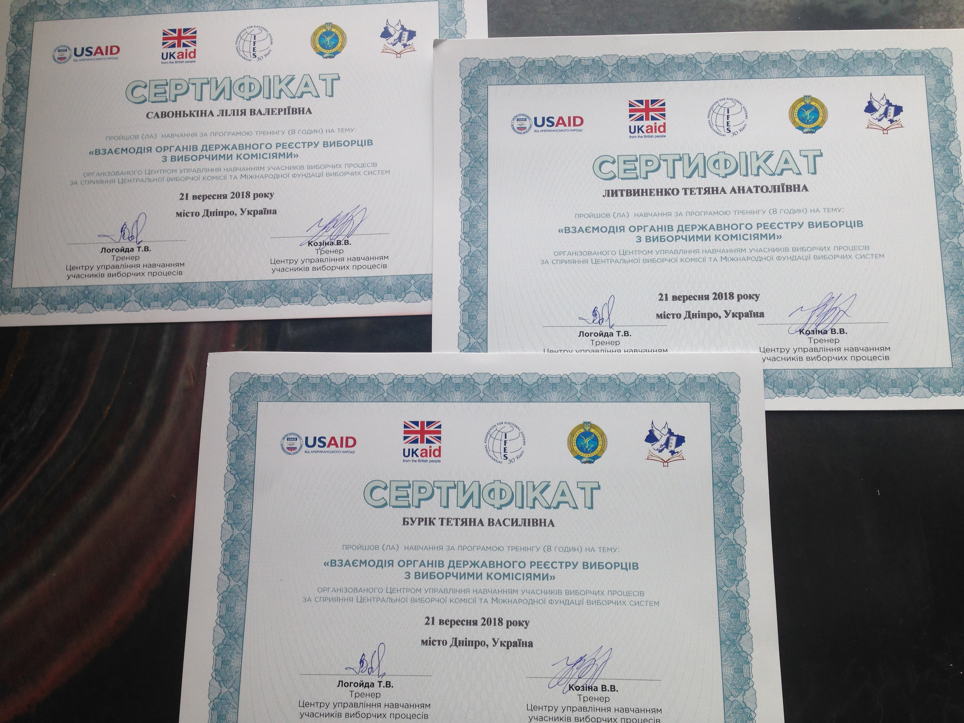 Працівники відділу постійно працюють над підвищенням свого професійного рівня шляхом самоосвіти, прийняття участі в навчанні посадових осіб виконкому районної у місті ради, відвідування курсу підвищення кваліфікації. Розпорядник Державного реєстру виборців надав можливість не рідше 1 разу на квартал проходити тестування за темами: «Державний реєстр виборців», «Робота в АІТС», «Операційна система MS Windows XP», «Нормативні документи Державного реєстру виборців» та інші. За сприянням Центральної виборчої комісії та Міжнародної фундації виборчих систем, Центром управління навчання учасників виборчих процесів були проведені тренінги для органів Державного реєстру виборців. У вересні 2018 року працівники відділу пройшли навчання на тему «Взаємодія органів Державного реєстру виборців з виборчими комісіями», про що отримали відповідний сертифікат.