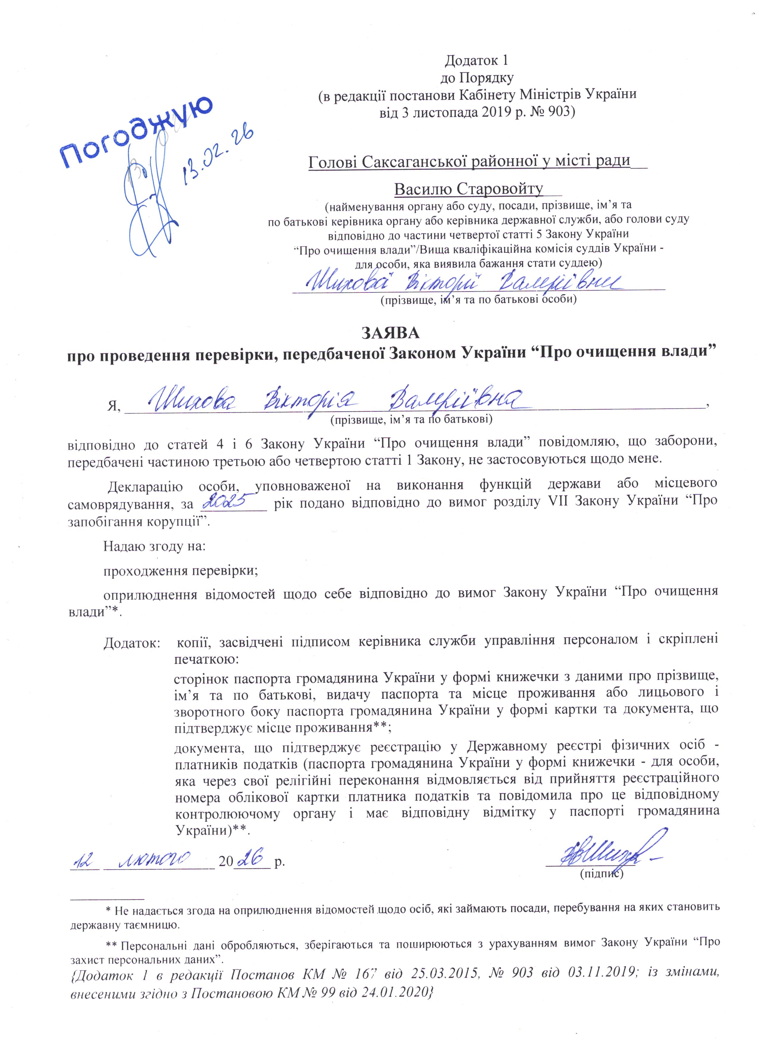13 лютого 2026 року розпочато проведення перевірки щодо Шихової Вікторії Валеріївни, яка працює на посаді головного спеціаліста відділу з благоустрою та комунального господарства управління благоустрою та житлово-комунального господарства, передбаченої Законом України "Про очищення влади".