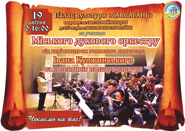 19 квітня 2016 року о 16.00 у концертному залі КЗ МПК «Саксагань» відбудеться визначна культурна подія - святковий концерт міського духового оркестру до 25-річчя Незалежності України під керівництвом головного деригента – Івана Кулжинського.