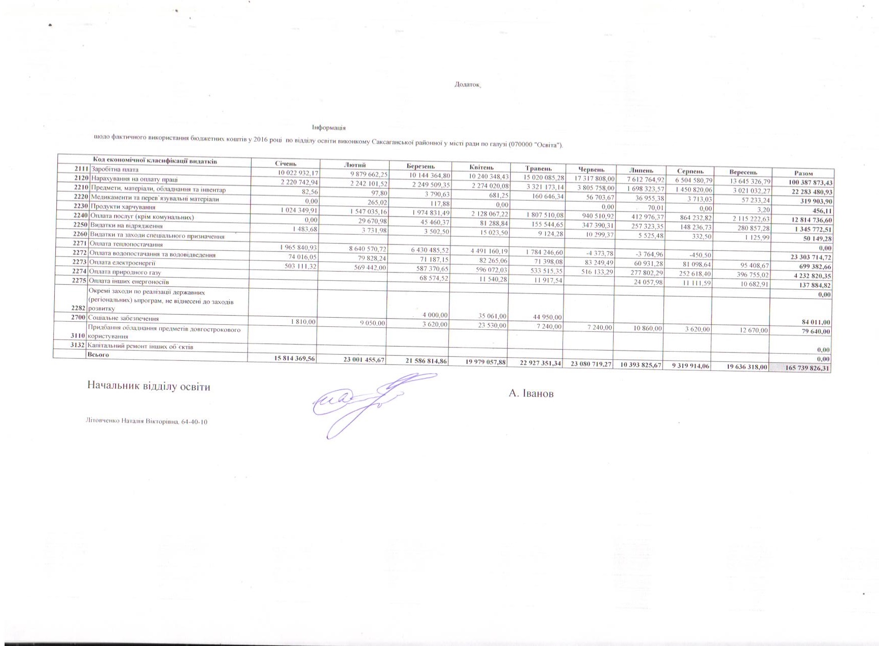 Інформація щодо фактичного використання бюджетних коштів у 2016 році по відділу освіти виконкому Саксаганської районної у місті ради