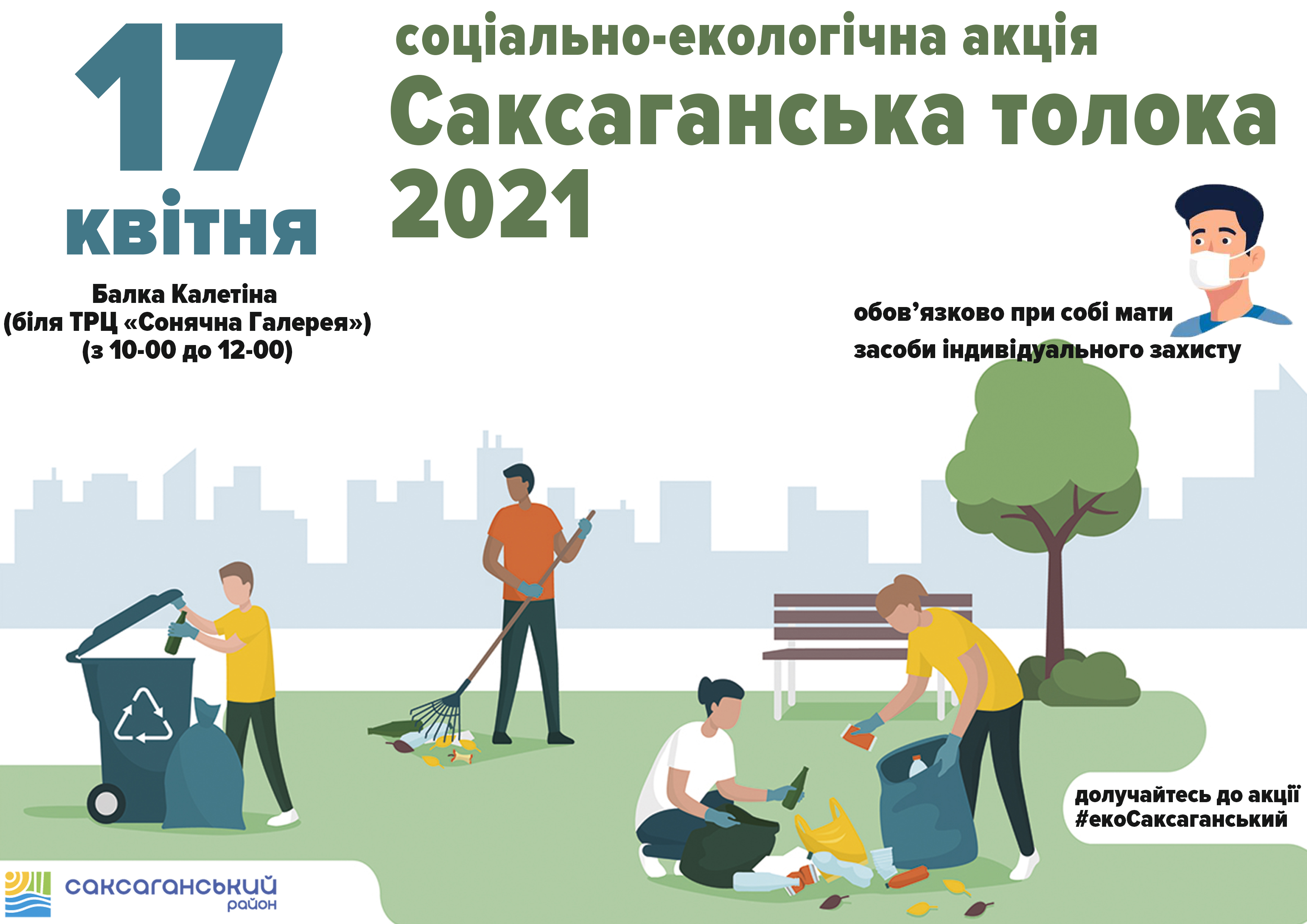 Виконком Саксаганської районної у місті ради долучається до підтримки Всеукраїнської акції «За чисте довкілля» та запрошує всіх небайдужих саксаганців приєднатися 15 та 17 квітня до «Саксаганської толоки 2021»