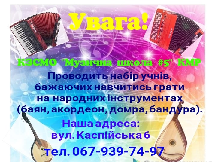 Комунальний закладі спеціалізованої мистецької освіти «Музична школа №5» Криворізької міської ради проводить набір учнів, бажаючих навчитись грати на народних інструментах (баян, акордеон, домра, бандура).