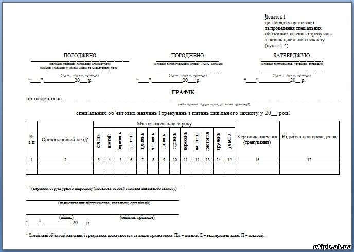 Виконкомом Саксаганської районної у місті ради нагадує, що до 01 вересня суб’єкти господарювання повинні здійснити складання графіків проведення спеціальних об’єктових навчань і тренувань з питань цивільного захисту на наступний рік. Даний графік затверджується керівником підприємства, установи або закладу попередньо погоджується (в частині дати проведенні) з керівником Криворізьких міських курсів І категорії у сфері цивільного захисту та в обов’язковому порядку погоджується головою районної у місті ради та начальником Криворізького міського управління ГУ Державної служби України з надзвичайних ситуацій у Дніпропетровській області.
