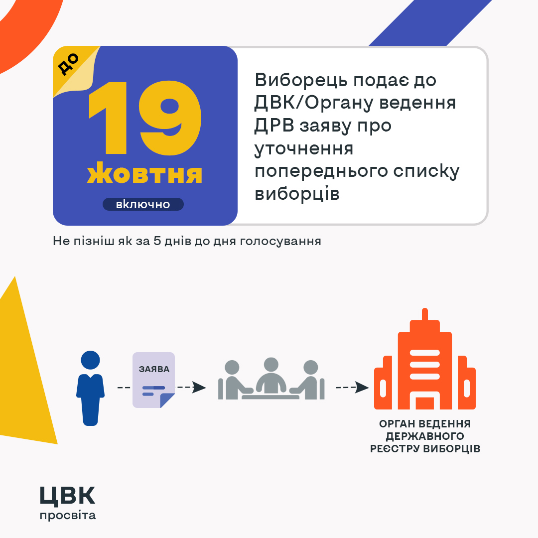 Виборець може звернутися до дільничної виборчої комісії або безпосередньо до відділу ведення Державного реєстру виборців не пізніше 19 жовтня 2020 року із заявою про уточнення попереднього списку виборців, а також про включення або виключення зі списку виборців.
