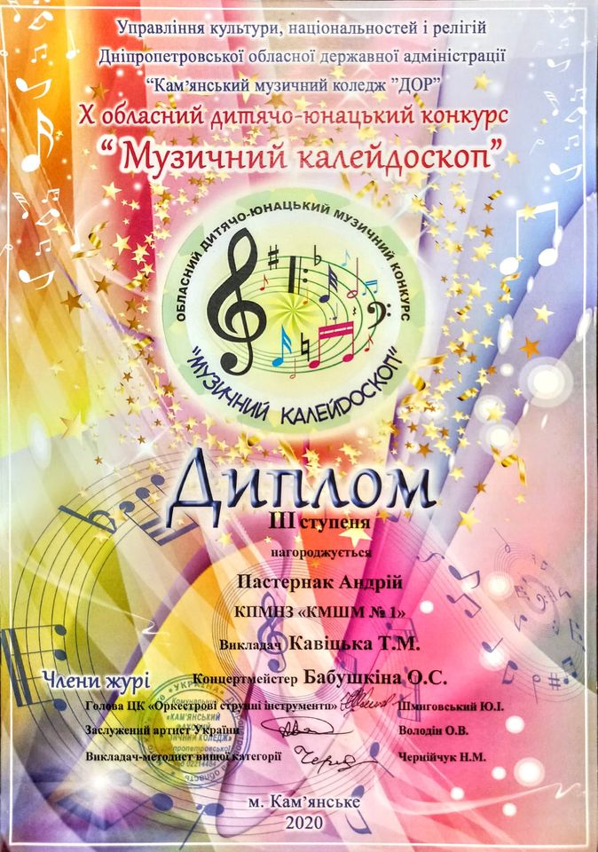 Вітаємо учня оркестрового відділу комунального закладу спеціалізованої мистецької освіти «Школа мистецтв №1» Криворізької міської ради Пастернака Андрія (струнна секція), викладач Тетяна Кавіцька за зайняте III місце в номінації «Оркестрові струнні інструменти» посів.