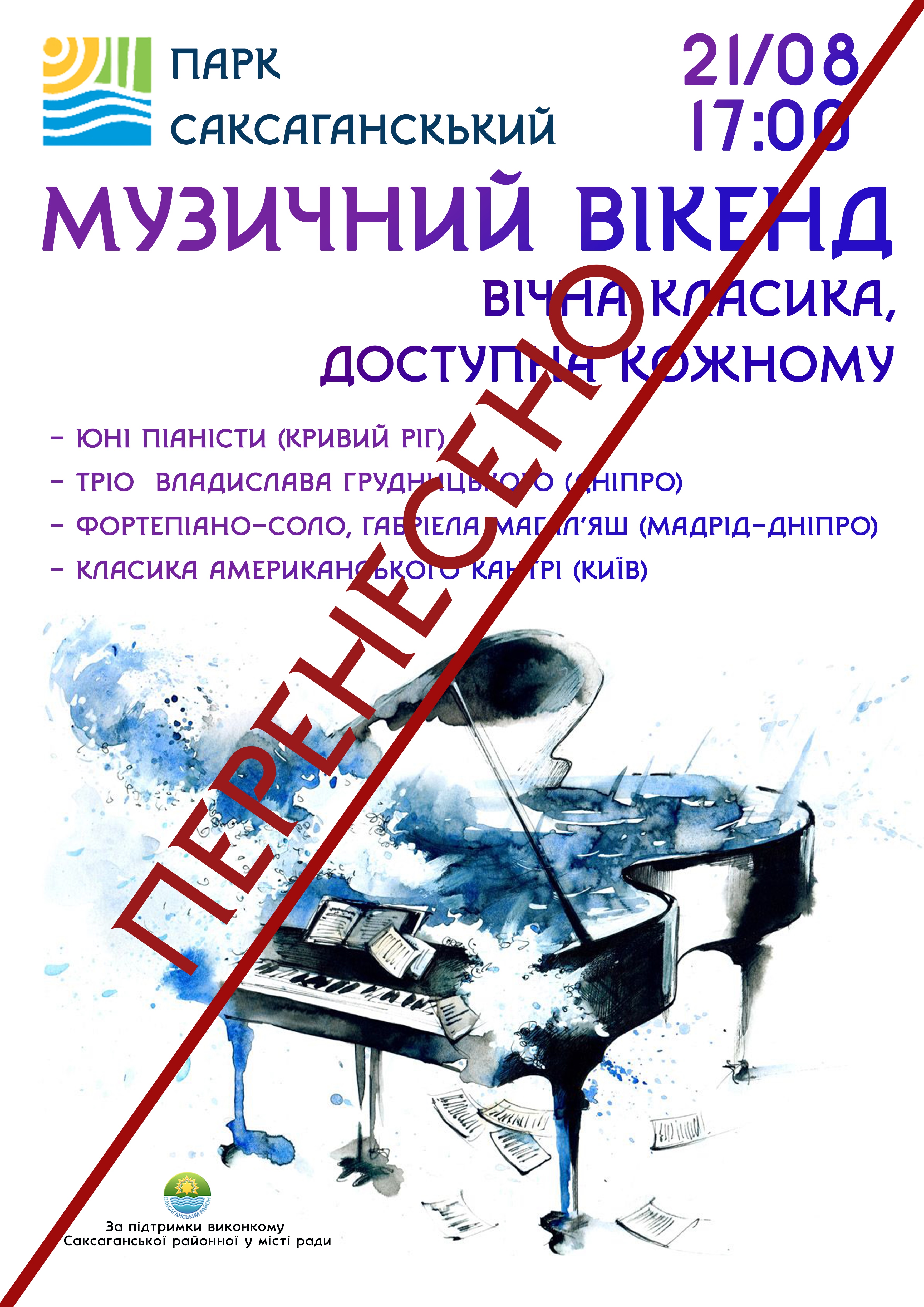 УВАГА! Концерт класичної музики, який заплановано на 21.08.2021 у рамках проєкту «Музичний вікенд. Вічна класика, доступна кожному!» буде перенесено!!!