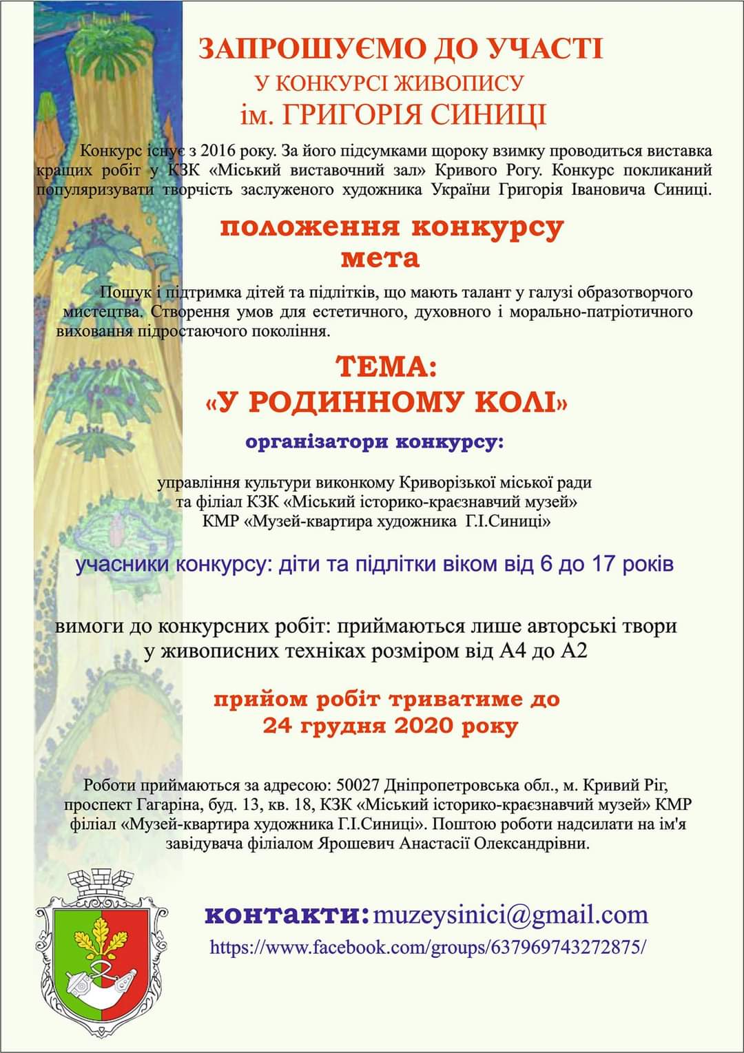 Запрошуємо усіх бажаючих до участі у конкурсі живопису ім. Григорія Синиці.