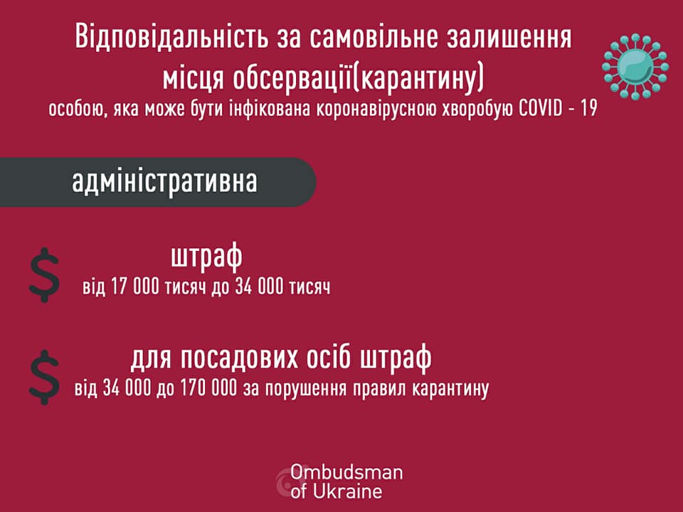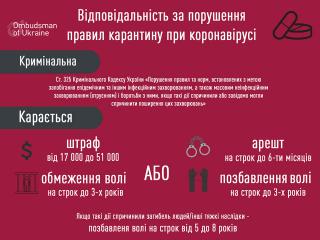 На сайті Уповноваженого Верховної Ради України з прав людини оприлюднено інформацію, яка наглядно роз’яснює про адміністративну та кримінальну відповідальність, передбачену за порушення правил карантину та розповсюдження коронавірусної інфекції Covid-19