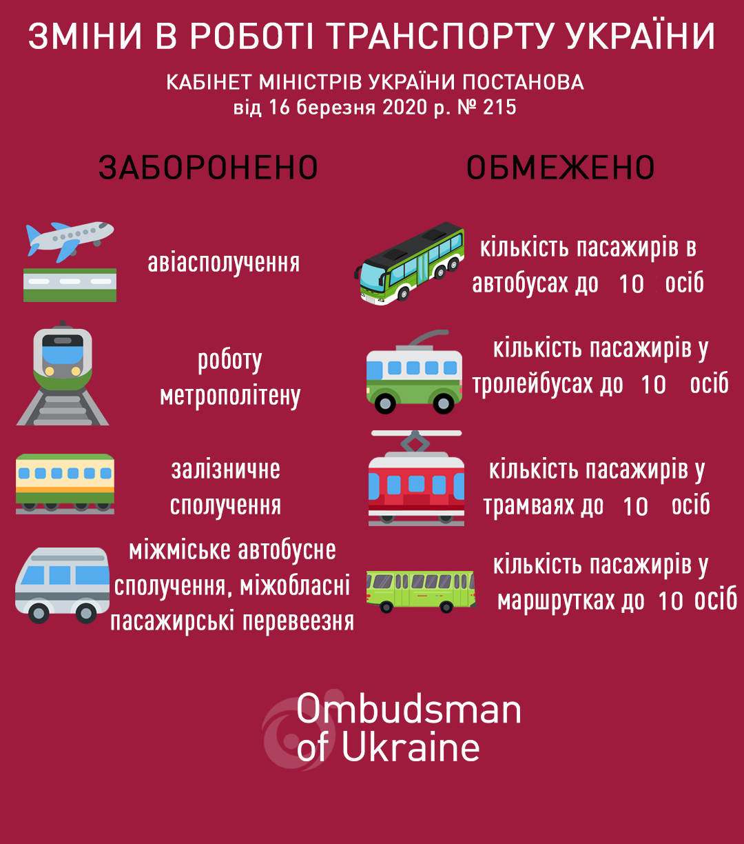 Крім того, відповідно до розпорядження Кабінету міністрів вводяться обмеження на пересування між містами і регіонами, а також встановлюються обмеження у користуванні міським громадським транспортом.