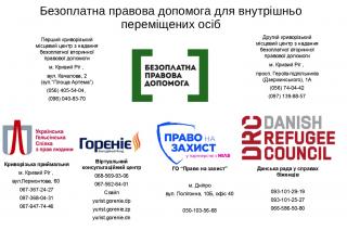 - безоплатна первинна правова допомога (правова інформація, роз'яснення та консультації, складання документів непроцесуального характеру);