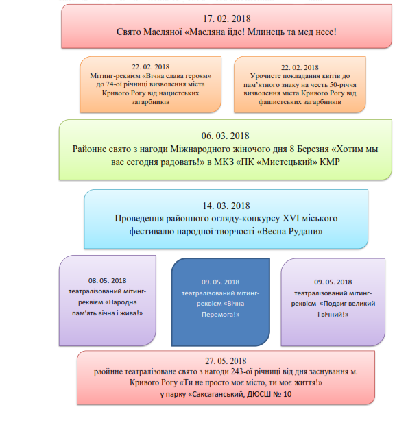 В цьому році для практичної реалізації вищезазначеного успішно втілюються у життя різноманітні дозвіллєві програми для юних мешканців району, підлітків і молоді, працівників підприємств та установ, людей похилого віку, ветеранів війни та праці. Відбувається велика кількість яскравих культурно-мистецьких, тематичних масових заходів, свят державного значення, ведеться пошук сучасних форм їх проведення.