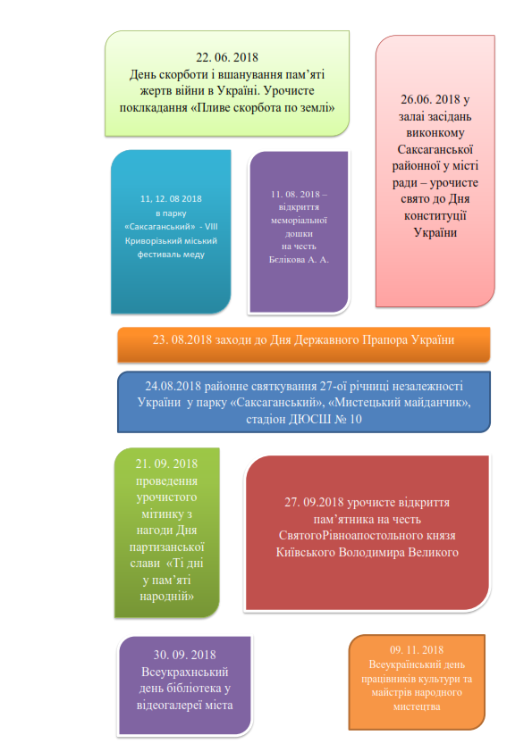 Протягом багатьох років провідним завданням у діяльності відділу культури, в тому числі й в поточному 2018 році, є організація змістовного дозвілля та естетичний розвиток мешканців Саксаганського району, виховання творчих здібностей підростаючого покоління саксаганців.