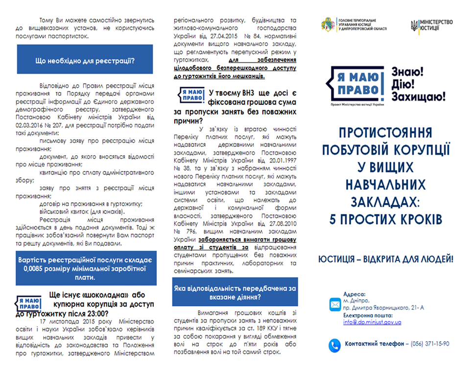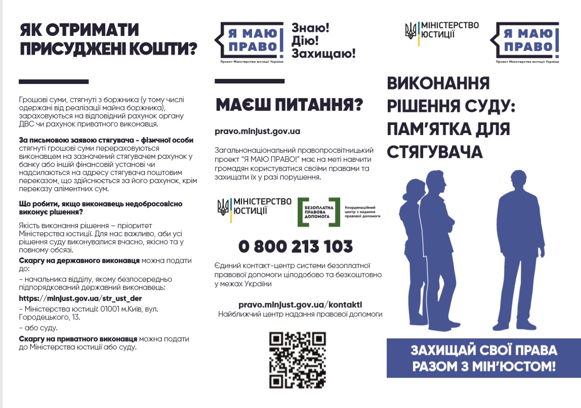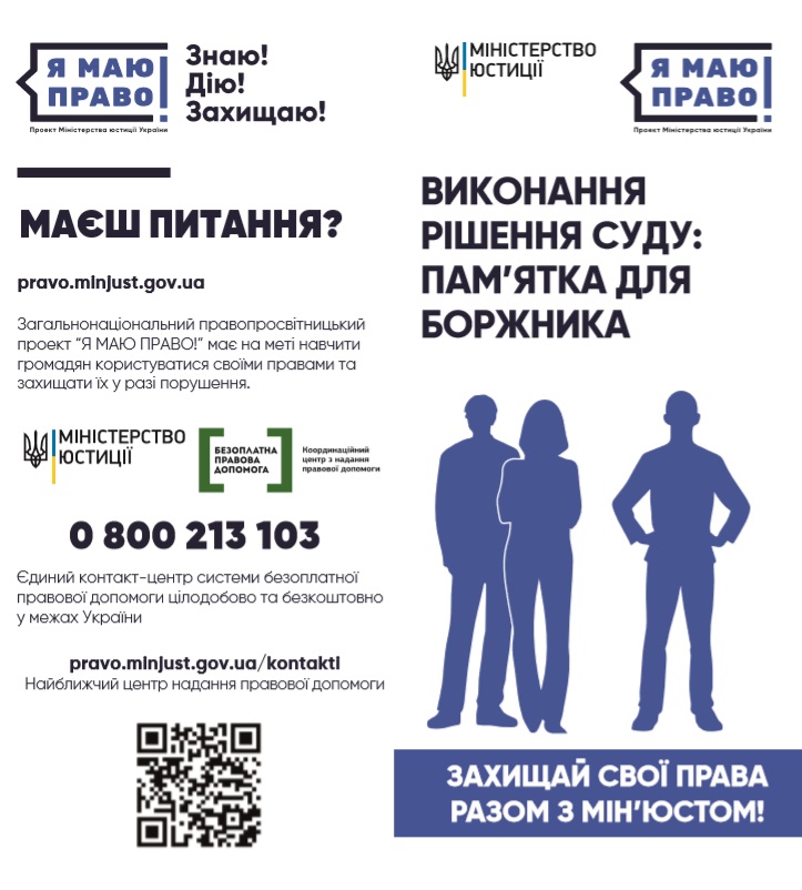Загальнонаціональній правопросвітницький проект «Я МАЮ ПРАВО!» реалізується Міністерством юстиції України у співпраці з системою безоплатної правової допомоги та територіальними органами юстиції. Мета – підвищити юридичну грамотність українців та сформувати нову правову культуру в суспільстві. Це масштабна реформа правової свідомості, яка забезпечить сталий розвиток України як сучасної демократичної держави. Проект покликаний не лише інформувати громадян про їхні права, а й навчити їх, як ці права захищати. Для цього готуються чіткі й зрозумілі поради, як діяти, коли відбувається порушення прав.