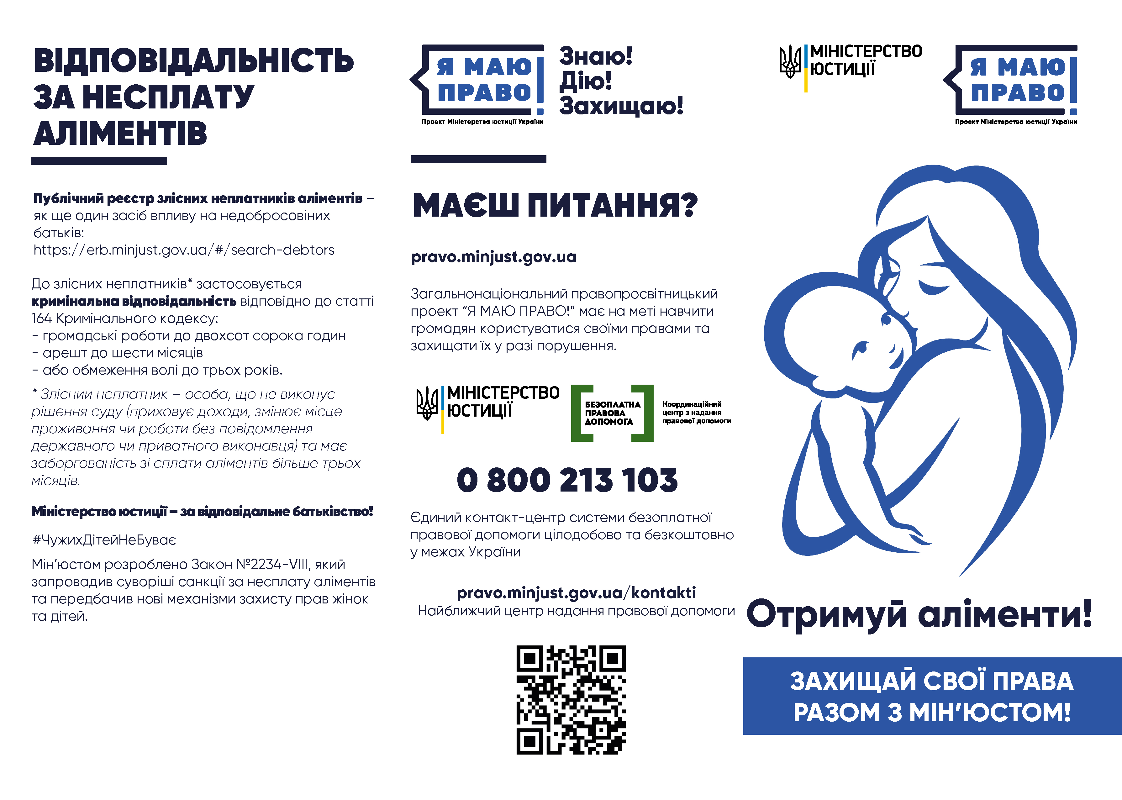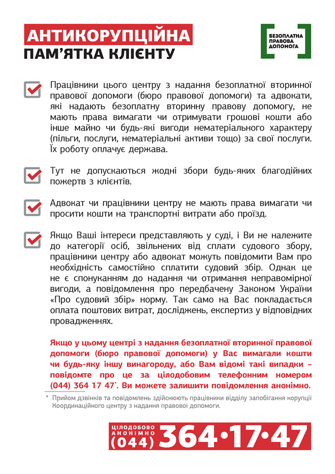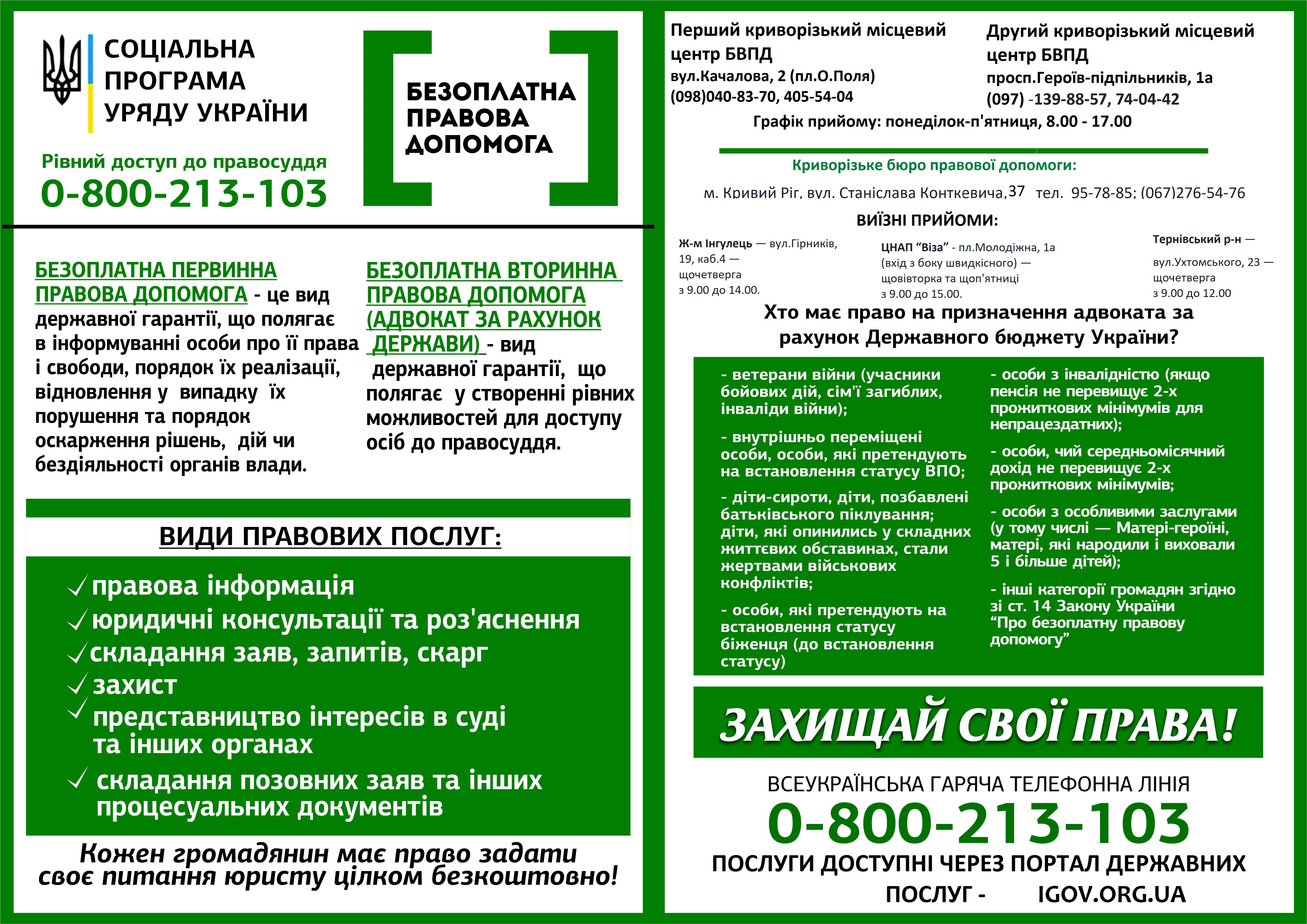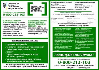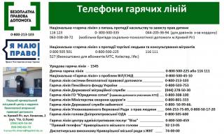Телефон гарячої лінії системи безоплатної правової допомоги 0-800-213-103 (цілодобово, безкоштовно).