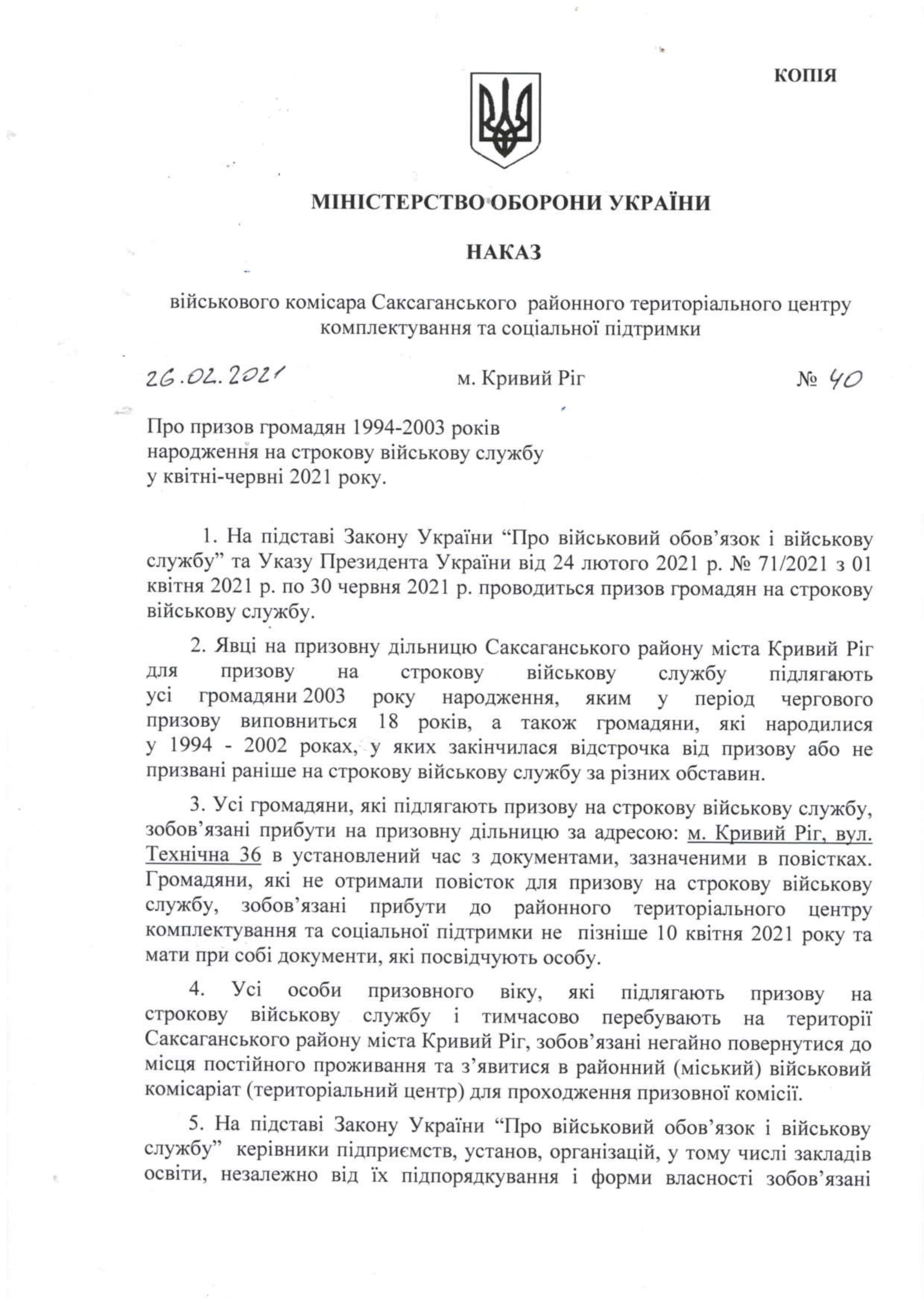 Про призов громадян 1994-2003 років народження на строкову військову службу у квітні-червні 2021 року