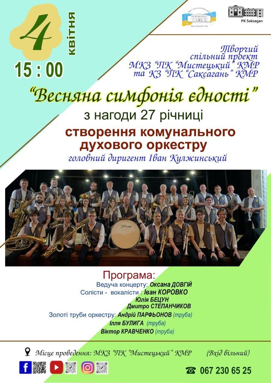 04.04.2026 о 15.00 у Палаці культури «Мистецький», з нагоди 27-річчя створення муніципального духового оркестру, відбудеться яскрава мистецька подія - спільний творчий проєкт Палацу культури «Мистецький» та Палацу культури «Саксагань» під назвою «Весняна симфонія єдності.