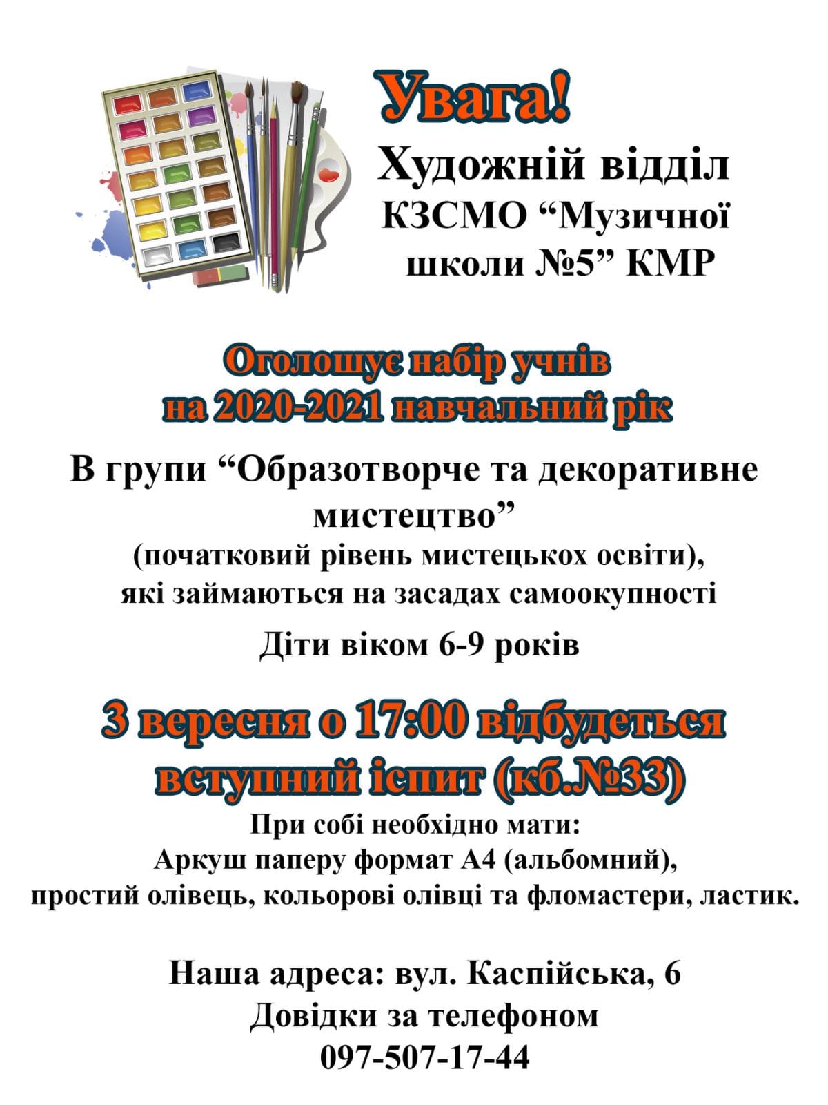 Художній відділ Комунального закладу спеціалізованої мистецької освіти «Музична школа №5» Криворізької міської ради оголошує набір учнів на 2020-2021 навчальний рік. В групі «Образотворче та декоративне мистецтво» (початковий рівень мистецької освіти), діти віком з 6 до 9 років.