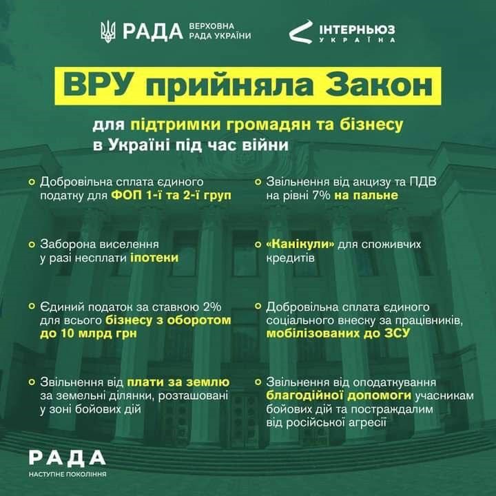 Зокрема на час воєнного стану для великого бізнесу розширили можливість користуватися опцією єдиного податку (ліміт підвищено з 10 млн. до 10 млрд. грн.) та зняли ще ряд обмежень.