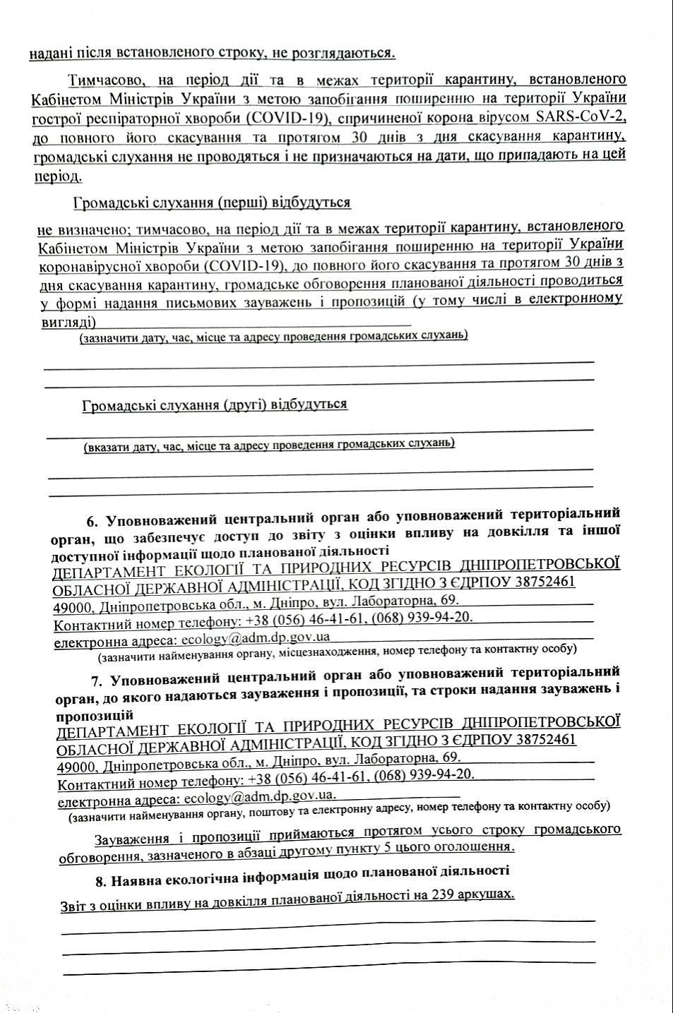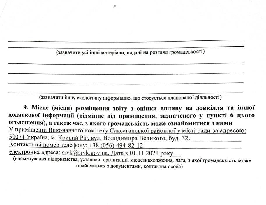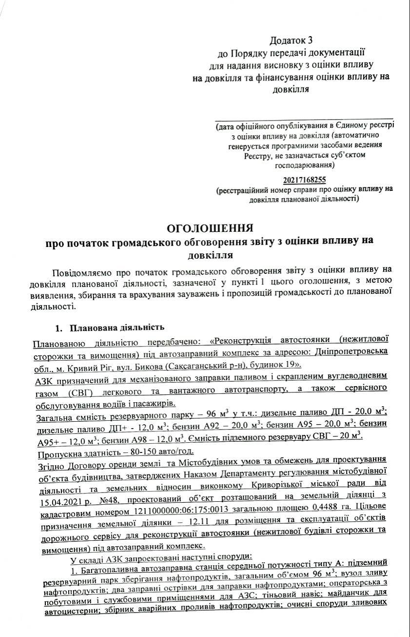 Оголошення про початок громадського обговорення звіту з оцінки впливу на довкілля