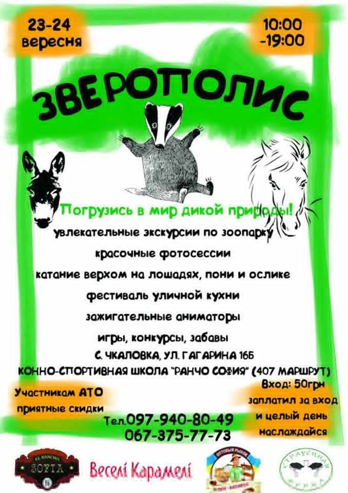 - «Зверополіс або в гості на ранчо» – обравши дану екскурсію Вас чекає – катання на конях, поні і ослику, подорож-екскурсія по контактному зоопарку, фестиваль вуличної кухні (узбецький плов, шашлики, коржі, хот-доги), запальні аніматори, яскраві фото з тваринами, тварин можна буде погодувати (бублики-сушка і цукор-рафінад), ігри, конкурси, забави.