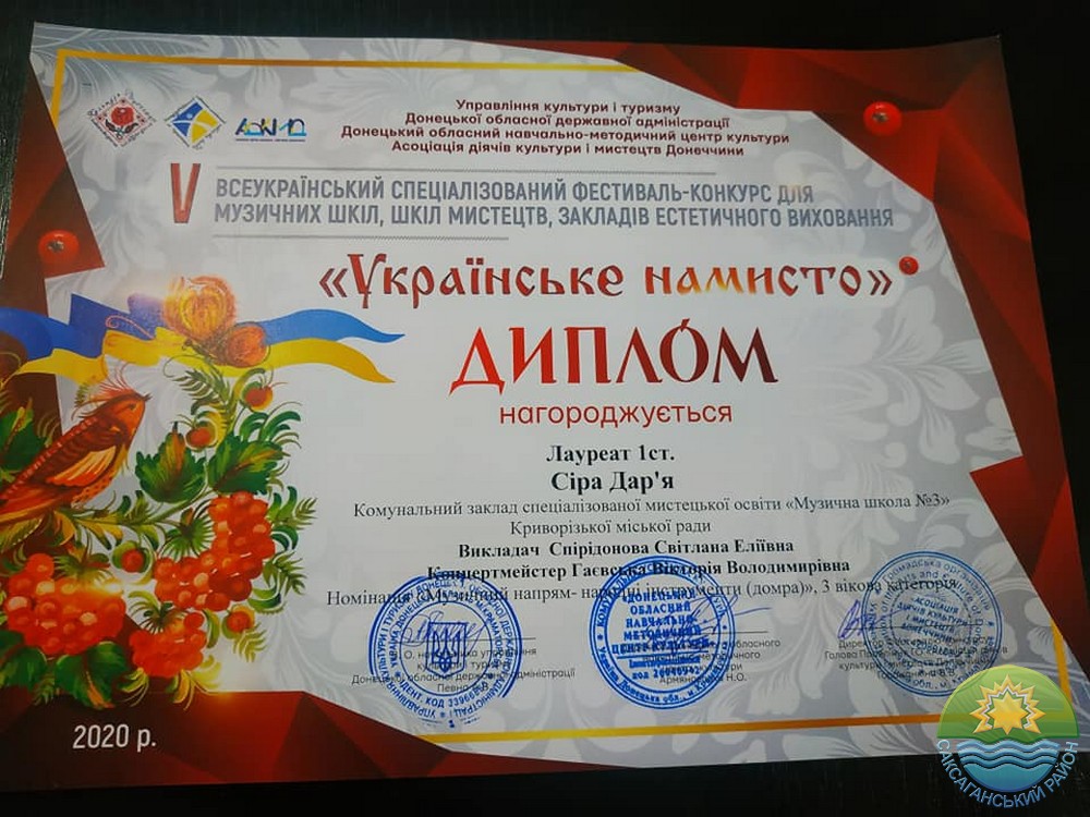 Відділ культури виконкому Саксаганської районної у місті ради щиро вітає Дар'ю, її викладача та концертмейстера Спірідонову С.Е. та Гаєвську В. В.
