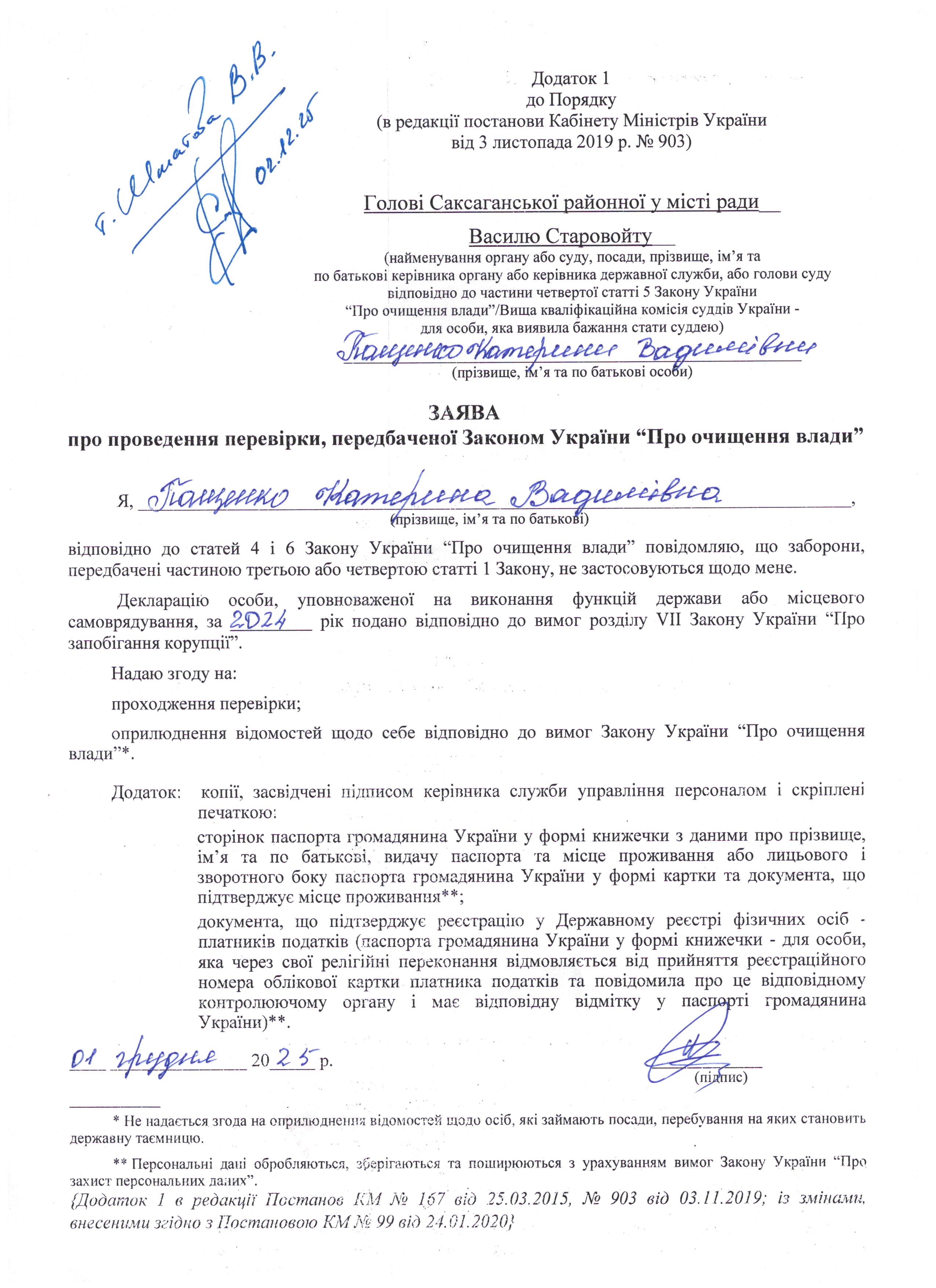 03 грудня 2025 року розпочато проведення перевірки щодо Пащенко Катерини Вадимівни, яка працює на посаді головного спеціаліста сектору протокольної роботи та службового документообігу загального відділу, передбаченої Законом України "Про очищення влади".