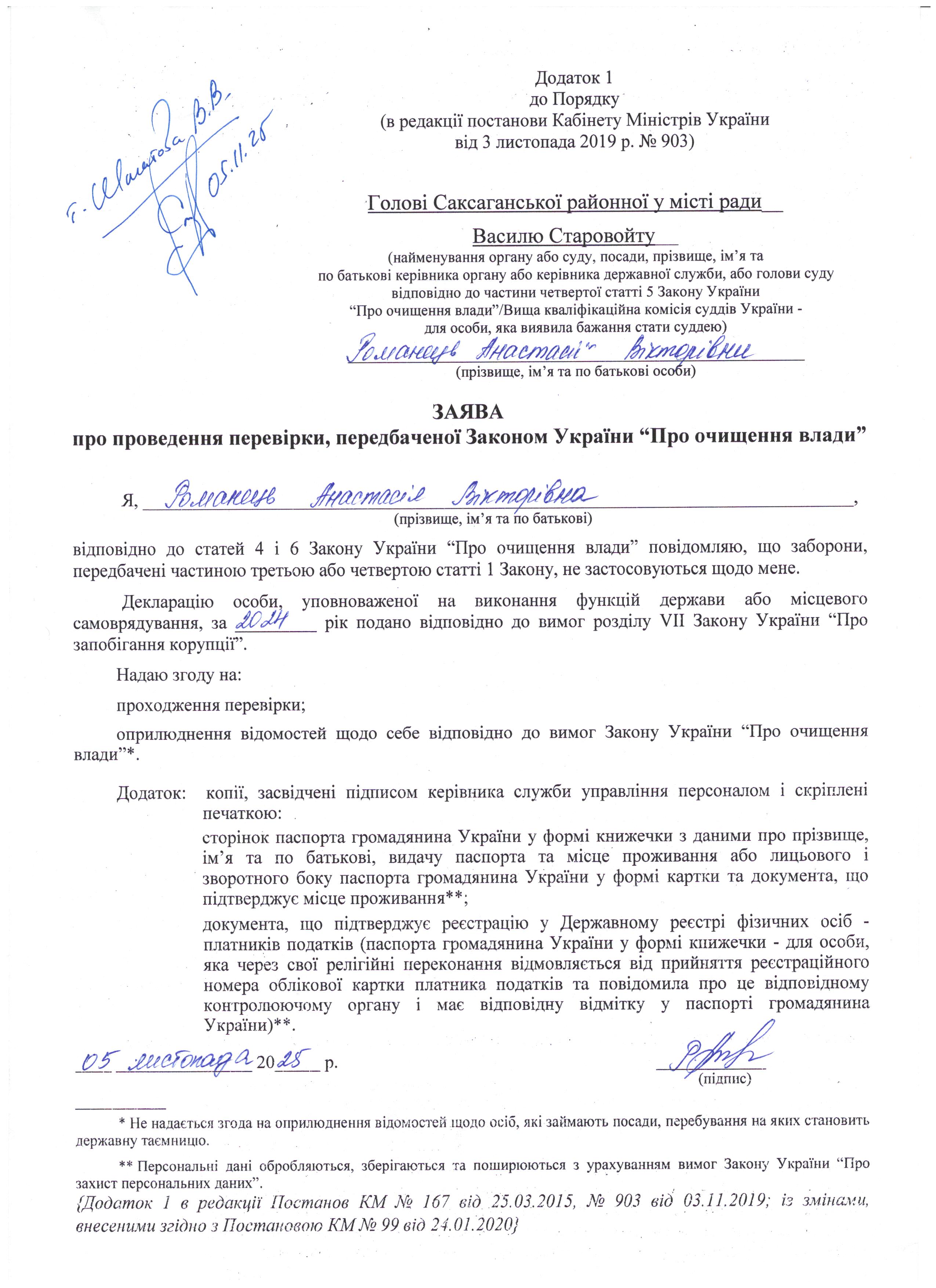 05 листопада 2025 року розпочато проведення перевірки щодо Романець Анастасії Вікторівни, яка працює на посаді головного спеціаліста відділу по організації надання соціальних послуг управління праці та соціального захисту населення, передбаченої Законом України "Про очищення влади".