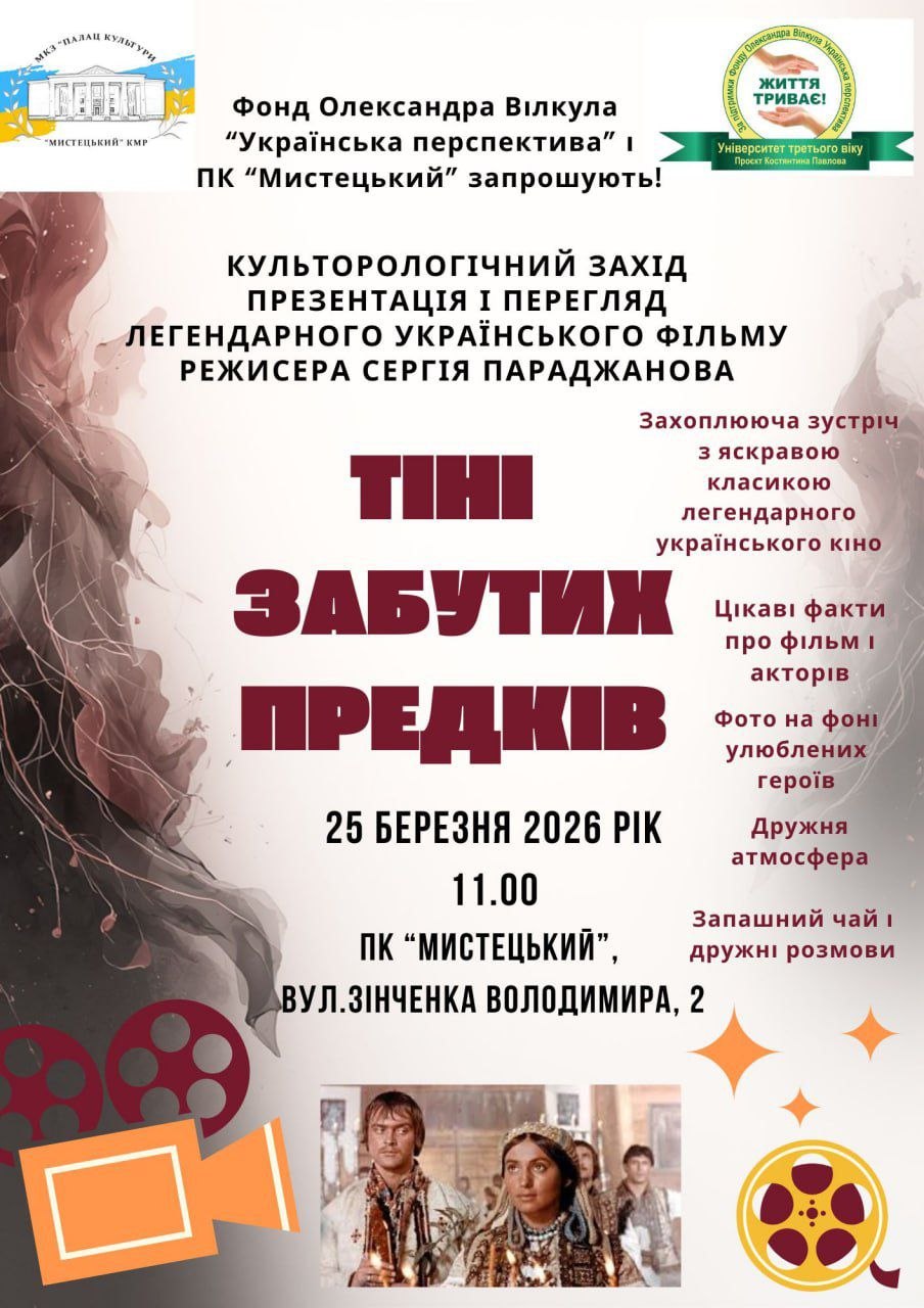 25 березня об 11.00 у Палаці культури «Мистецький» відбудеться культурологічний захід - презентація та перегляд легендарного українського фільму Сергія Параджанова «Тіні забутих предків».