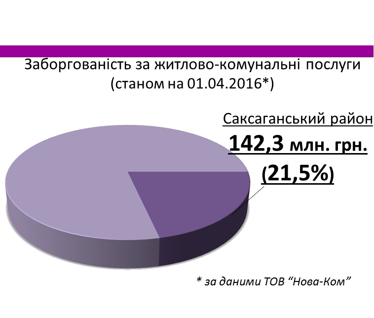 Станом на 01. 04. 2016 заборгованість мешканців Саксаганського району за спожиті житлово-комунальні послуги та енергоносії становить 142,3 млн. грн. (21,5 %) від загального боргу по місту (662 млн. грн.).