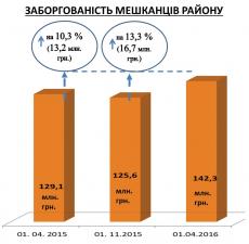 У порівнянні з початком опалювального сезону (01. 11. 2015) заборгованість мешканців району зросла на 16,7 млн. грн. (13,3 %), у порівнянні з аналогічним періодом минулого року заборгованість збільшилась на 13,2 млн. грн. (10,3 %).