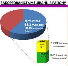 Найбільше мешканці району заборгували за послуги з централізованого опалення: 83,2 млн. грн., що становить 58,4 % від суми загальної заборгованості (ДП «Криворізька теплоцентраль» - 42,5 млн. грн. (29,9 %) та КПТМ «Криворіжтепломережа» - 40,6 млн. грн. (28,6 %).