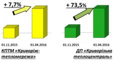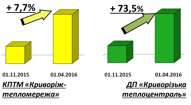 Приріст заборгованості по відношенню до початку опалювального сезону 2015-2016 років по ДП «Криворізька теплоцентраль» склав 18 млн. грн. (73,5 %) по КПТМ «Криворіжтепломережа» - 3 млн. грн. (7,7 %).