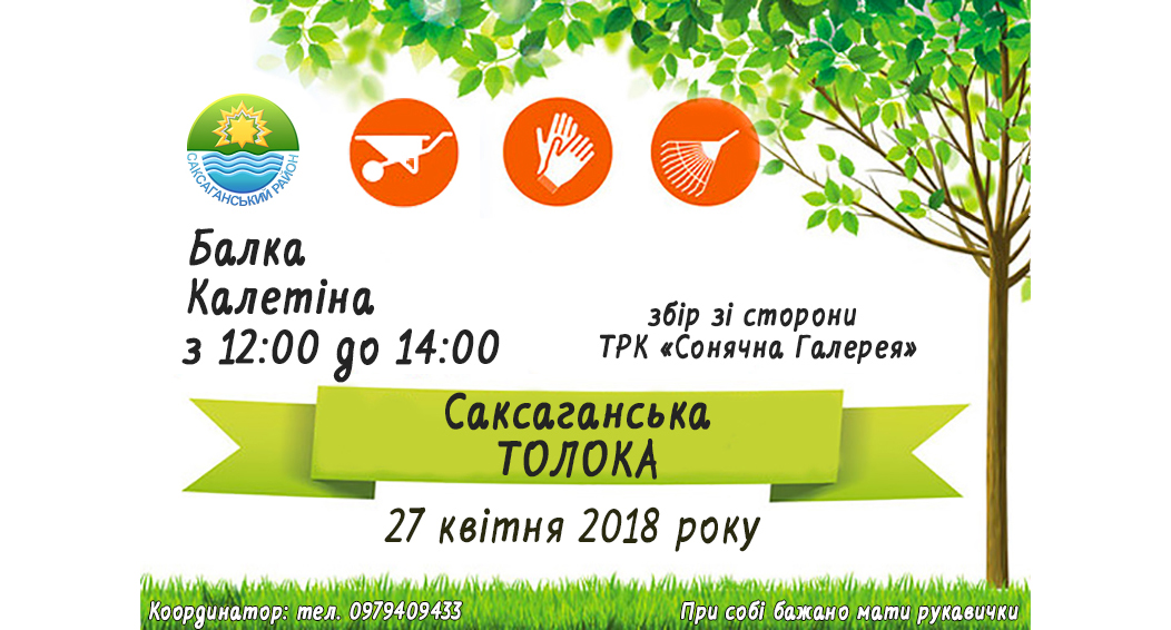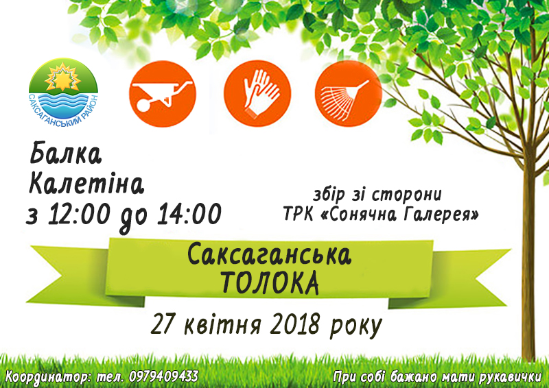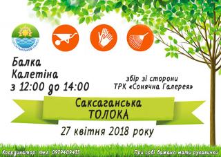Виконком Саксаганської районної у місті ради долучається до підтримки всеукраїнського місячника з благоустрою та закликає всіх небайдужих саксаганців приєднатися до «Саксаганської толоки 2018»: з 12-00 до 15-00 28 квітня 2017 року біля балки Калетіна (збір - зі сторони ТРК «Сонячна Галерея»).