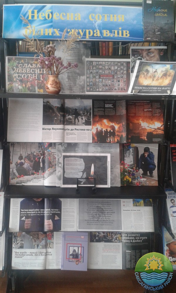 20 лютого стало для українців назавжди пам’ятним днем – Днем Героїв Небесної Сотні. В пам'ять про полеглих за майбутнє України 20 лютого 2018 року в юнацькому відділі комунального закладу культури “Міська бібліотека для дорослих” Криворізької міської ради було проведено патріотичну бесіду «А сотню вже зустріли небеса». Бібліотекарі разом з користувачами відновили хронологію подій, що відбувалися на Майдані Незалежності в Києві у 2013-2014 роках, згадали поіменно всіх Героїв Небесної Сотні. У ході заходу лунали патріотичні вірші та пісні, відеосюжети. До уваги читачів було презентовано книжкову виставку «Небесна сотня білих журавлів».