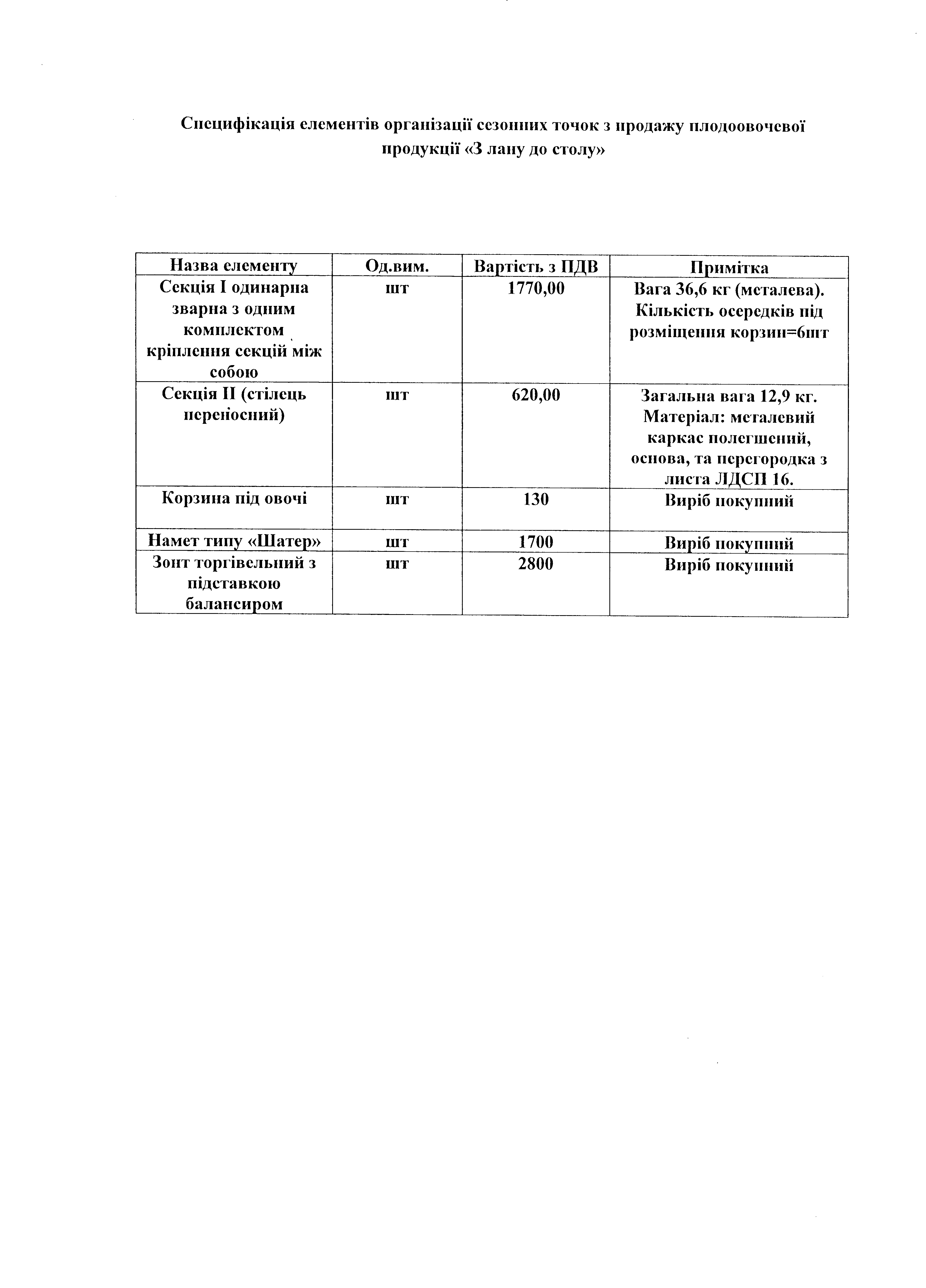 Специфікація елементів організації зазначених об’єктів сезонної торгівлі додається
