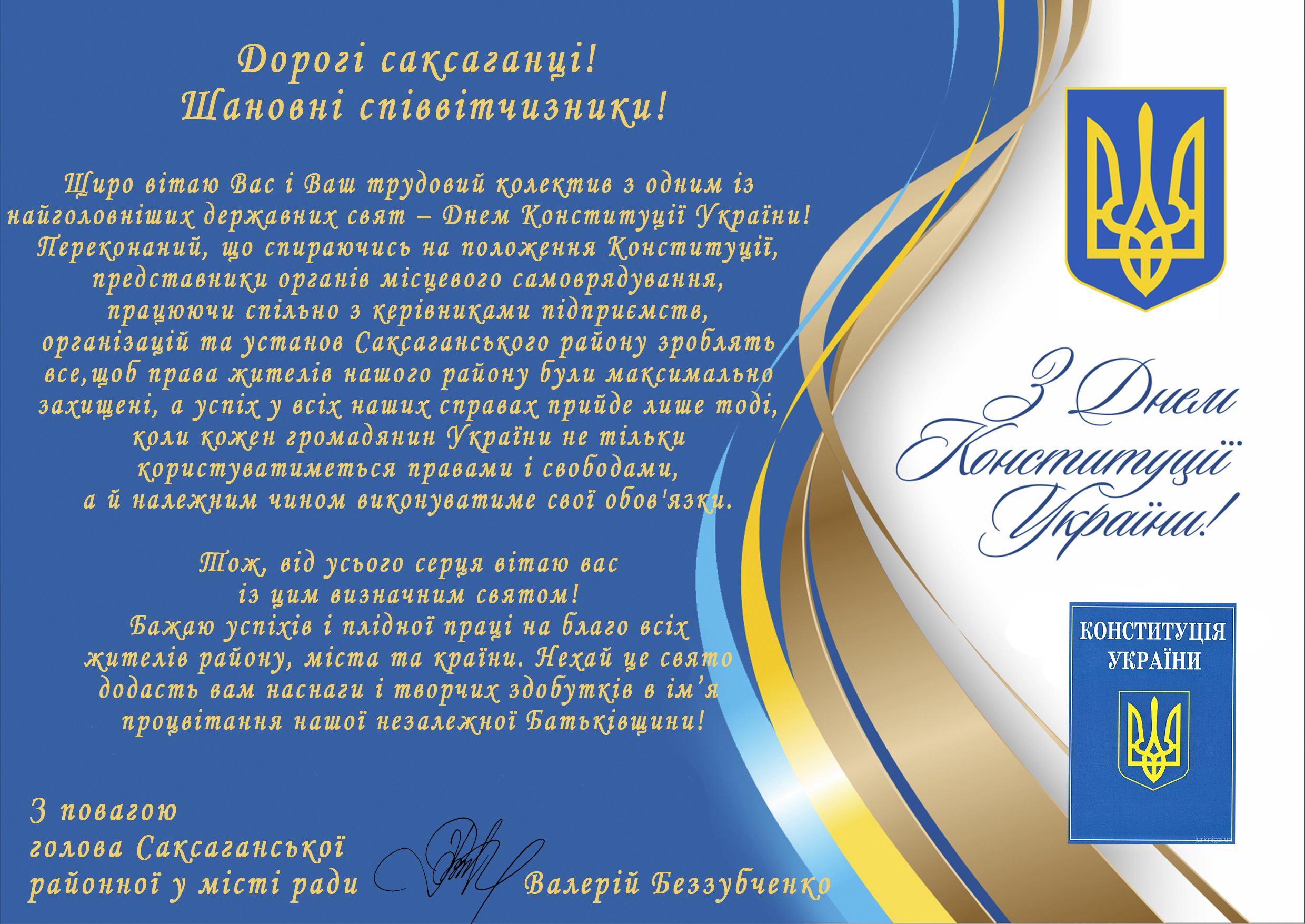 І сьогодні, нашим спільним завданням є неухильне дотримання принципів, що закладені у головному документі держави. Щоденною працею робити внесок у формування сучасних економічних, політичних та духовних реалій, створювати найкращі умови для розвитку і благополуччя нашого району, міста та всієї України!