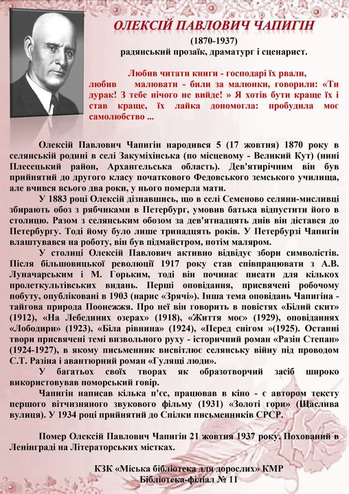 Шановці саксаганці та мешканців міста, до вашої уваги літературне досьє - Олексій Чапигін (150 років від Дня народження). Дізнатись більше про письменника та ознайомитись з творами вам допоможуть книги бібліотеки-філіалу № 11 комунального закладу культури «Міська бібліотека для дорослих» Криворізької міської ради.