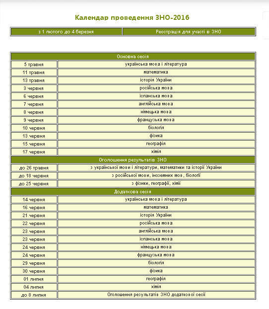 Міністерством освіти і науки затверджено Календарний план підготовки та проведення ЗНО в 2016 році, яким визначено дати проведення тестування з кожного навчального предмета, а також дати проведення основних заходів, що супроводжуватимуть проведення тестування у наступному році.