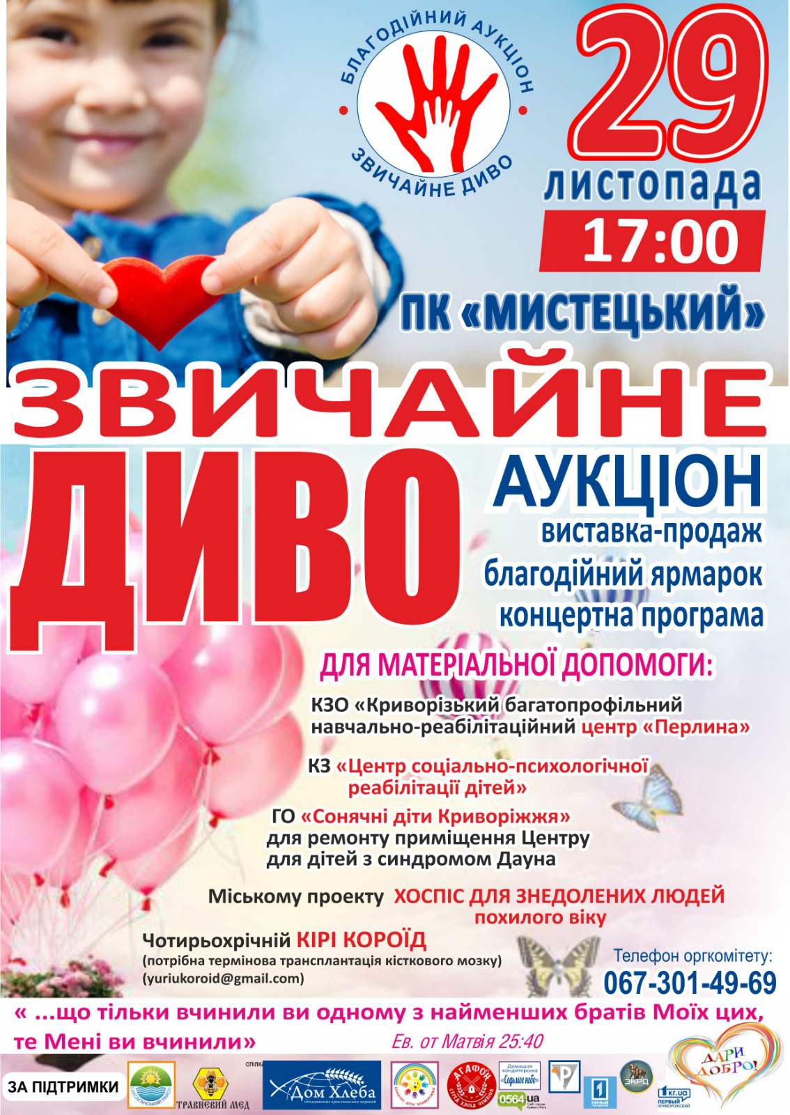 29 листопада 2019 року в міському комунальному закладі «Палац культури «Мистецький» Криворізької міської ради вже вкотре традиційно проходитиме свято добра й доброчинності, благодійний вечір-аукціон «Звичайне диво». Усі добрі люди матимуть можливість допомогти комунальному закладу освіти «Криворізький багатопрофільний центр «Перлина» Дніпропетровської обласної ради»; комунальному закладу «Центр соціально-психологічної реабілітації дітей» Криворізької міської ради; ГО «Сонячні діти Криворіжжя» для ремонту приміщення Центру для дітей з синдромом Дауна «Сонячні діти Криворіжжя»; реалізації міського проекту зі створення в Кривому Розі хоспісу для знедолених людей похилого віку; чотирьохрічній Кірі Короїд (потрібна термінова трансплантація кісткового мозку).