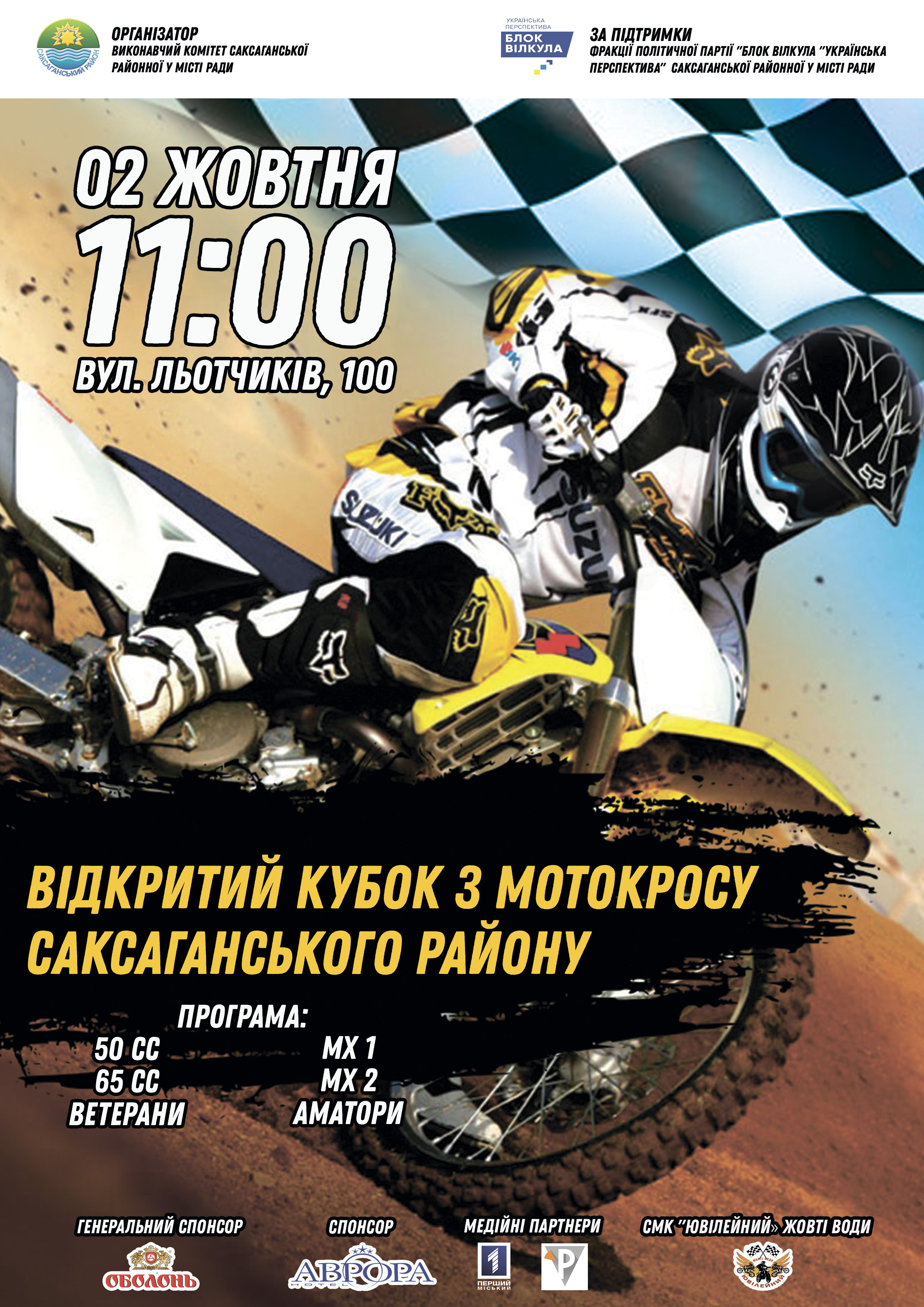 Перший Відкритий Кубок з мотокросу Саксаганського району пройде 02 жовтня 2021 року об 11.00 на автодромі «Кривбас-Екстрім» за адресою: вулиця Льотчиків, 100. В заїздах приймають участь мотогонщики з усієї України та закордону