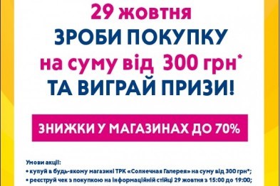 Призи на День народження ТРК «Сонячна Галерея» вигравати просто. Для цього необхідно зробити покупку в будь-якому магазині торгово-розважального комплексу на суму від 300 грн. 29 жовтня 2016 року. Саме в цей день потрібно зареєструвати чек на інформаційній стійці (з 15:00 до 19:00). Фінал та визначення переможців відбудеться на головній святковій сцені ТРК «Сонячна Галерея» о 19:30.