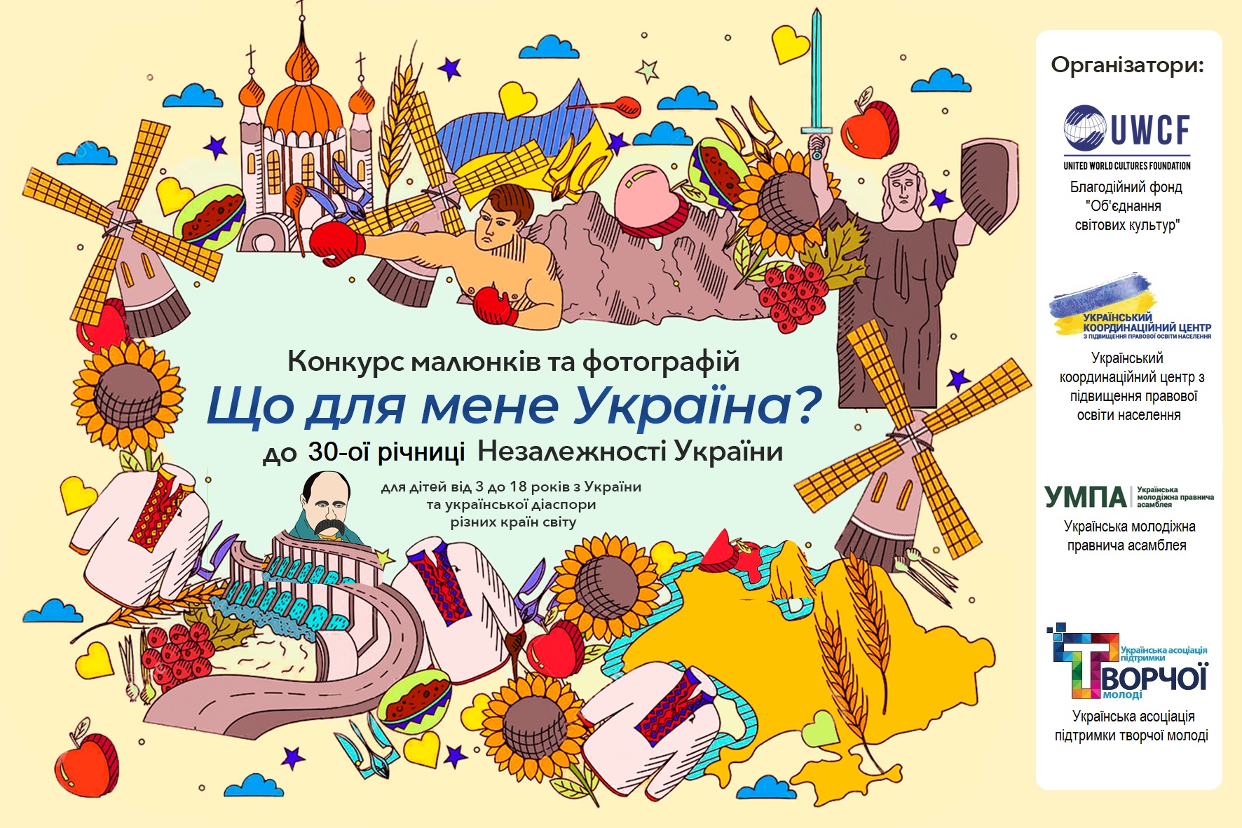 З метою культурно-освітнього розвитку, формування у дітей і підлітків національної ідентичності, патріотичного виховання; соціальної підтримки талановитої молоді, сприяння їх самореалізації та творчому розвитку, активного залучення творчої молоді до соціально-вагомої діяльності, Благодійний фонд «Об’єднання світових культур» (https://www.facebook.com/uwcfoundation), Український координаційний центр з підвищення правової освіти населення (https://www.facebook.com/UkrainianCoordinationCenter), Українська молодіжна правнича асамблея, Українська асоціація підтримки творчої молоді проводять Всеукраїнський конкурс малюнків та фотографій «Що для мене Україна?», приурочений до 30-ї річниці Незалежності України.
